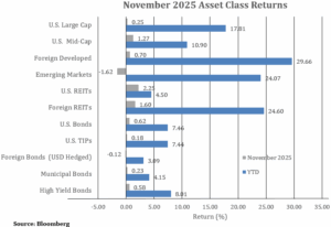 November was a volatile month for the U.S. stock market. Leading stock indexes declined for three straight weeks as investor sentiment slipped on concerns about the valuation of megacap tech stocks. However, as more economic data became available following the reopening of the federal government, the market staged a strong rebound. The late-month rally was largely driven by renewed hopes for a Federal Reserve (Fed) interest rate cut in December (Since the drafting of this article, the Fed did, in fact, reduce rates by 0.25%). Most benchmark equity indexes ended November with modest gains.