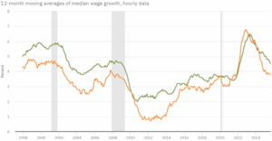 Below is a chart from the Federal Reserve Bank of Atlanta. It shows wage growth over time comparing high skill and low skill workers. Not surprisingly, there has been higher wage growth (roughly 1%) for high skilled over low skilled workers over time. However, that changed in the COVID period where wage growth was very similar between high and low skilled workers. Yet, wage growth for either segment did not keep up with inflation in the 2022 peak period. Most recently, however, the wage growth is reverting to the historical trend which is less favorable and more challenging for lower skill workers.